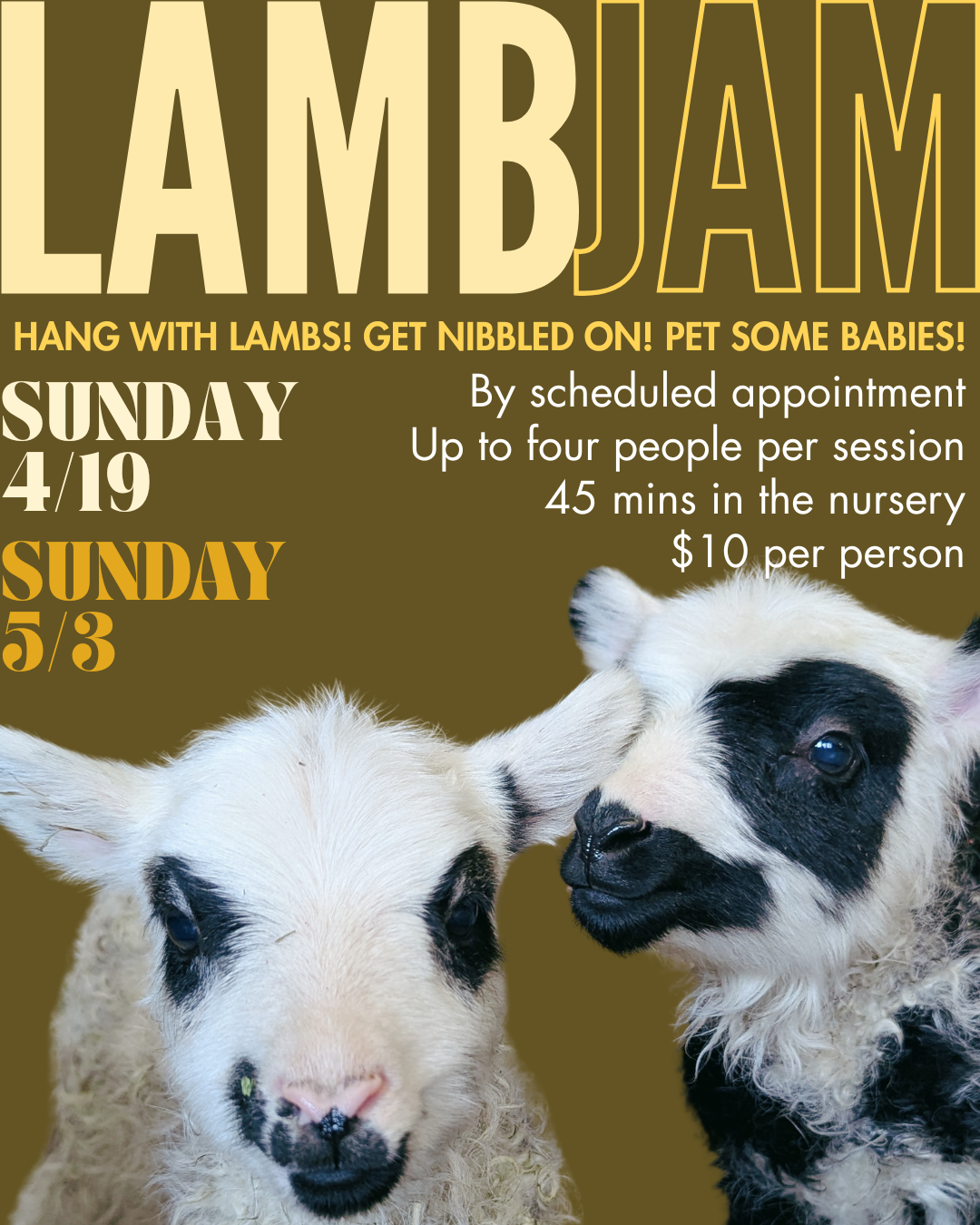 LAMB JAM 2026 is live. You can book at the link below to get nibbled, climbed, slept, and loved on by all of our spring lambs.